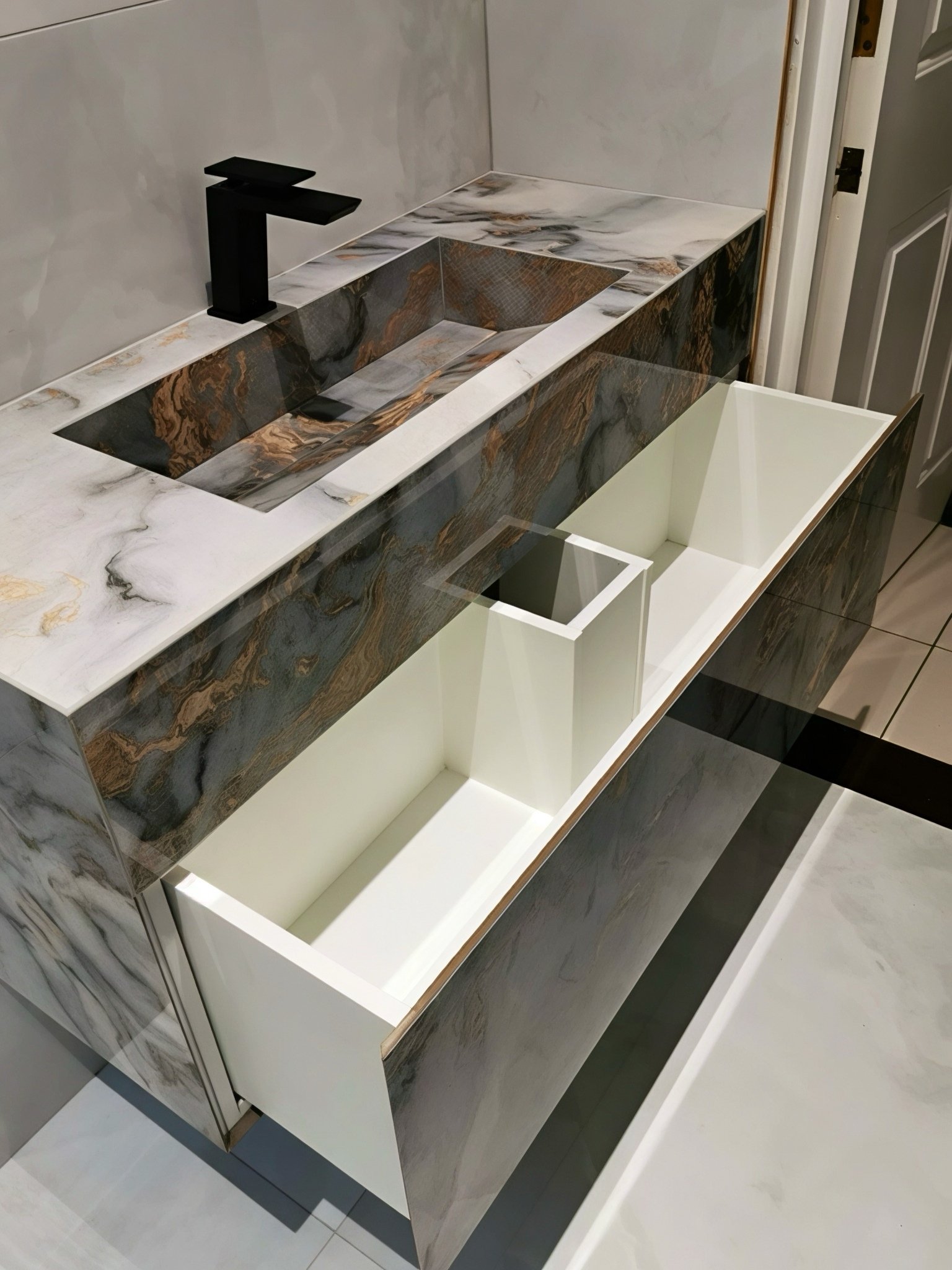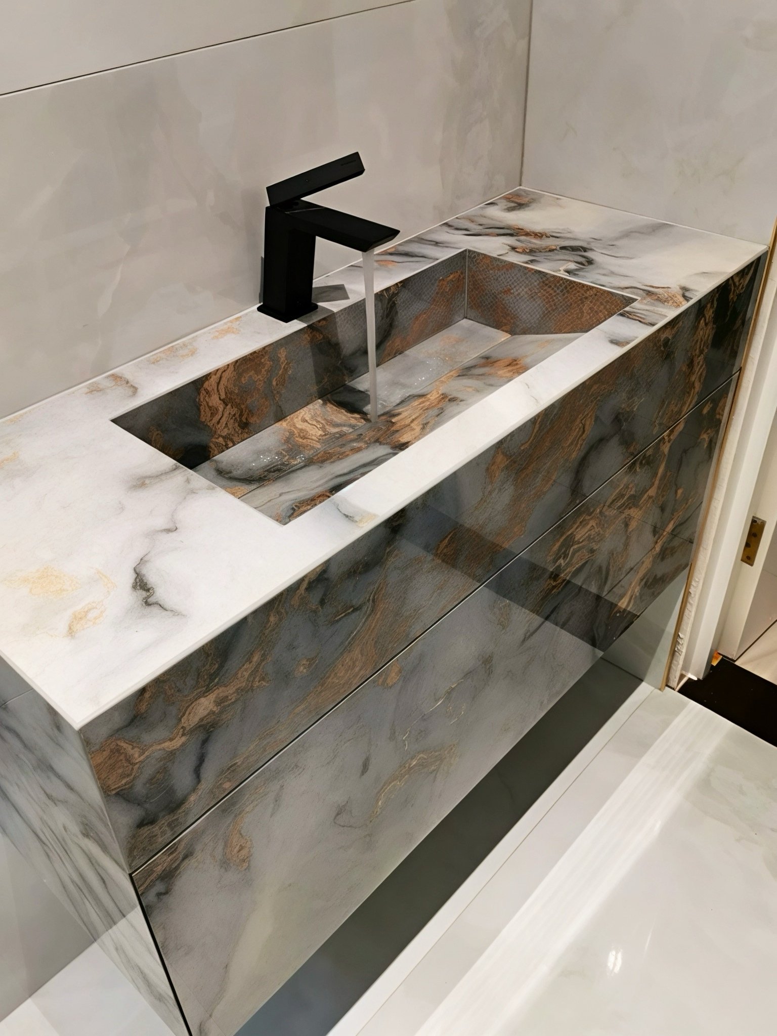 – Natural Veining: Each sink is crafted with unique colour tones and vein patterns, offering a truly one-of-a-kind design.